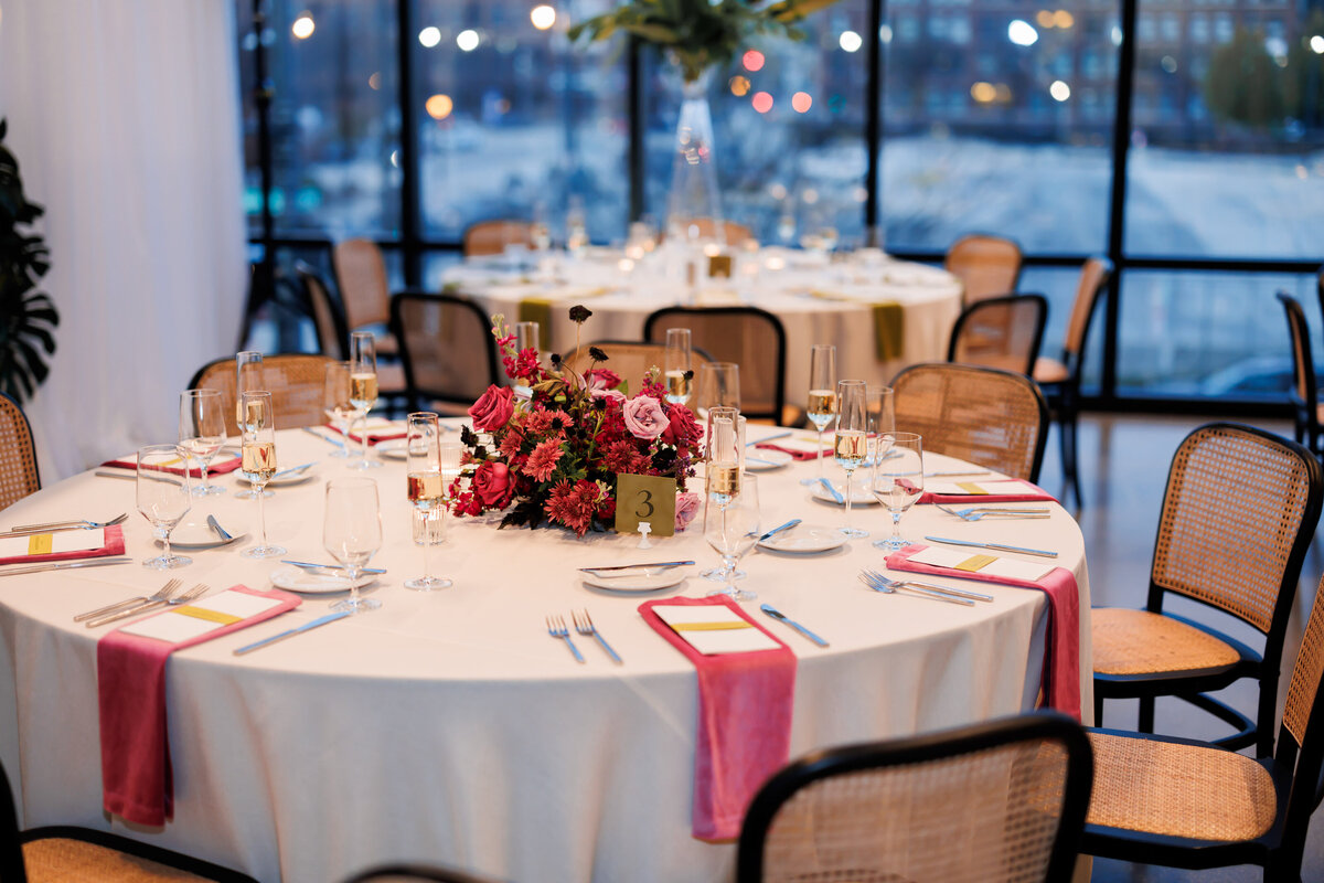 From the moment guests entered, it was clear this celebration was in a world of its own. The ceremony space, set against sweeping views of the Milwaukee skyline, featured a vivid fuchsia arch bursting with fluffy bougainvillea blooms and arrangements that seemed to grow organically from the floor. It was a feast of monochromatic color blocking.