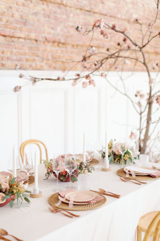 We pulled out all the stops when designing the florals to accompany this styled shoot organized by Midwestern Bride at The Treasury in Delavan.  Dried cotton stems, kissed with soft terra cotta color, manifested as whimsical fairytale trees.  Warm natural tones created a stunning palette against the gorgeous backdrop of The Treasury.